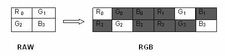 Finally, we need to declare another image buffer that will contain the RGB image. Remember that the size of the RGB is 3 times the size of the Bayer Pattern image. rgbbuffer is therefore assigned 3 times the buffer size (camera.capture_buffer). This buffer (rgbbuffer) will be passed as the destination buffer (the second parameter in BayerNearestNeighbor).