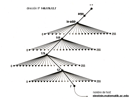 Un ejemplo: Nos recordamos que la IP de Einstein del instituto de matemáticas es "149.176.12.7" con el nombre de dominio "einstein.matematicas.ac.edu".