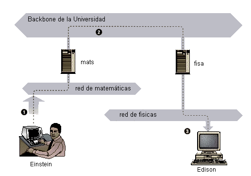 Como el software (rlogin, telnet, ftp etc.) de Einstein no puede mandar datos (paquetes de datos) directamente a Edison, la cual se encuentra en una red físicamente independiente, tiene que confiar en un gateway que transporta los paquetes al destino correspondiente. Es decir que el gateway "mats" dirige los paquetes al gateway "fisa", que tiene la misma función para la red de los físicos. La transferencia pasa vía el backbone de la universidad y "fisa" entrega los datos finalmente a Edison. Este esquema de transmisión de datos a un host lejano (computadora de una red) se llama Routing y los datos o paquetes de datos son designados datagrams.