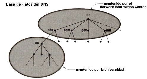 El Network Information Center p. ej. administra el dominio "edu" (educational) pero pasa la autoridad sobre el subdominio "ac.edu" (academic) a la Universidad, la cual autoriza al instituto de matemáticas para administrar el siguiente subdominio: "físicas.ac.edu" (Figura 3).