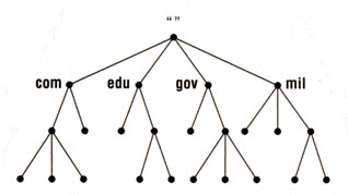 La estructura de la base de datos del DNS es mostrada en figura 2. La totalidad de la base de datos se muestra como un árbol (tree) invertido con la raíz (root) en la punta. El nombre de la raíz es la etiqueta NULL, pero se escribe con un solo punto ("."). Cada nudo del árbol representa tanto una partición de la totalidad de la base de datos, como un Dominio (domain) del Sistema de Dominio de Nombre. En adelante cada dominio puede ser dividido en particiones que se llaman Subdominios (subdomains), que son derivados como niños de sus nudos paternales.