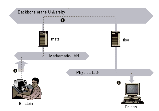 Da die auf Einstein installierte Software (rlogin, telnet, ftp, etc.) Datenpakete nicht direkt an Edison senden kann - der Rechner befindet sich schliesslich in einem physisch getrennten Netz - wird ein Gateway benötigt um die Daten oder besser Datenpakete an die entsprechende Stelle zu leiten. Dies bedeutet nun, daß der Gateway "mats" die Datenpakete an den Gateway "phys" leitet, welcher wiederum die Zuteilung der Daten an Edison übernimmt. Dieses Schema des Datentransfers an einen entfernten Computer (host) wird Routing genannt und die Daten bzw. einzelnen Datenpakete bezeichnet man als Datagramme (engl: datagram).