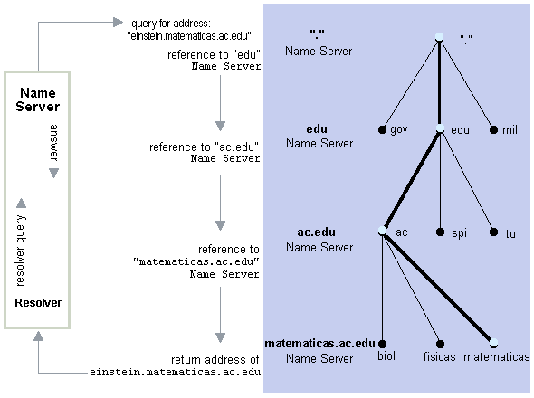 Der Nameserver ist ein Programm das den Serverteil des client-server Machanismus des DNS darstellt. Nameserver enthalten Informationen über bestimmte Segmente der Datenbank, welche selbige für Clients, sogenannte Resolver zur Verfügung stellen. Resolver bestehen häufig lediglich aus ein paar Libraryroutinen, welche Anfragen erstellen und diese durch das Netz an den Nameserver schicken.