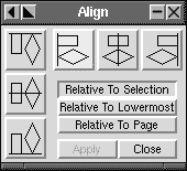 Align : Richtet ein oder mehrere Objekte relativ zu einander (zu den Ecken, dem oberen Rand oder zum Mittelpunkt), zur Seite oder zur Selektion aus.