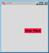 Example: place [ label .l -text "With Place"] -x 100 -y 100 .l configure -bg red
