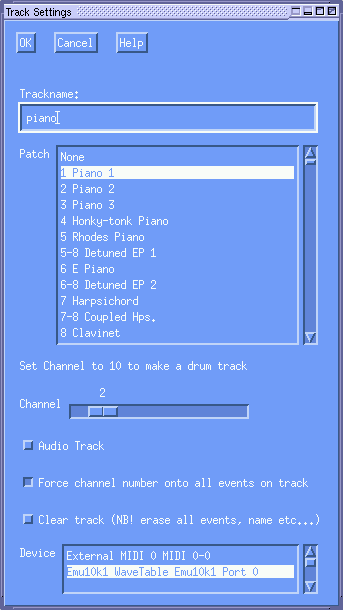You also set the midi channel in this window. There are 16 channels and each of your instruments should have its own channel. You can choose any channel you want, only channel 10 is reserved for drums. This means that even when you select a piano for channel 10 you will hear some kind of a drum sound. So if you want drums select channel 10, otherwise select any of the other channels!