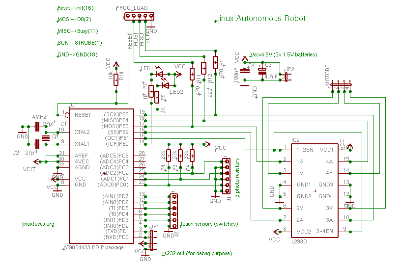 Il y a trois programmes de test différents inclus dans le paquetage logiciel du robot. Le programme ledtest fait clignoter les deux leds. Il se charge avec la commande "make ledtestload". Ceci compilera le programme et le chargera dans le microcontrolleur. Les deux leds doivent commencer à clignoter immédiatement après le chargement du programme. Une fois ce test réussi vous êtes certain que le microcontrolleur avec son oscillateur et les connexions de chargement depuis le PC sont fonctionnels.
