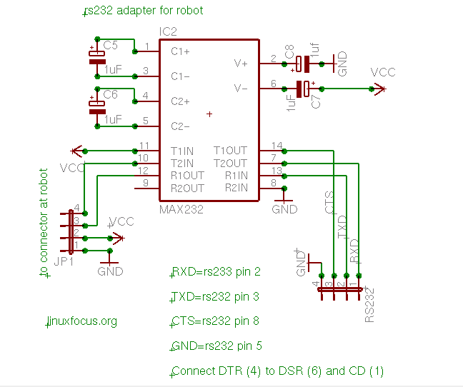 Le circuit de notre robot autonome devrait maintenant être prêt. Toutefois, se pose la question de savoir quoi faire si le robot ne fonctionne pas comme prévu à cause du logiciel. Rien n'est accessible, ni les valeurs des photo-résistances ni les décisions prises par le robot. Il nous faut une sorte d'écran ou d'affichage pour comprendre ce que fait le robot. L'interface série RS232 est bien adaptée à ce besoin car il est possible d'y afficher des contenus de variables et même de communiquer avec le robot. On peut par conséquent implanter le max232 et les autres composants nécessaires à la liaison série sur une platine séparée et la connecter à la demande: