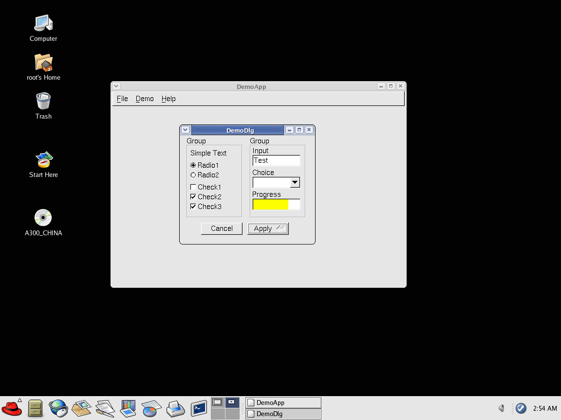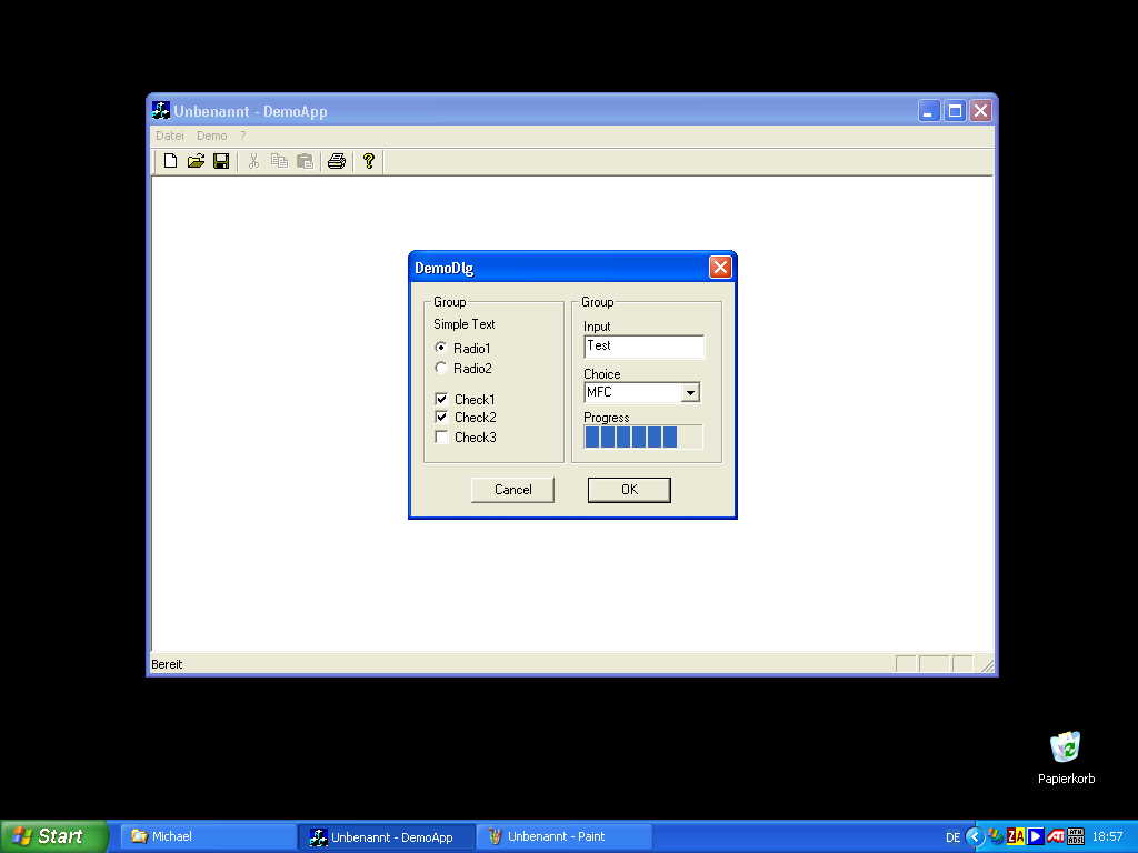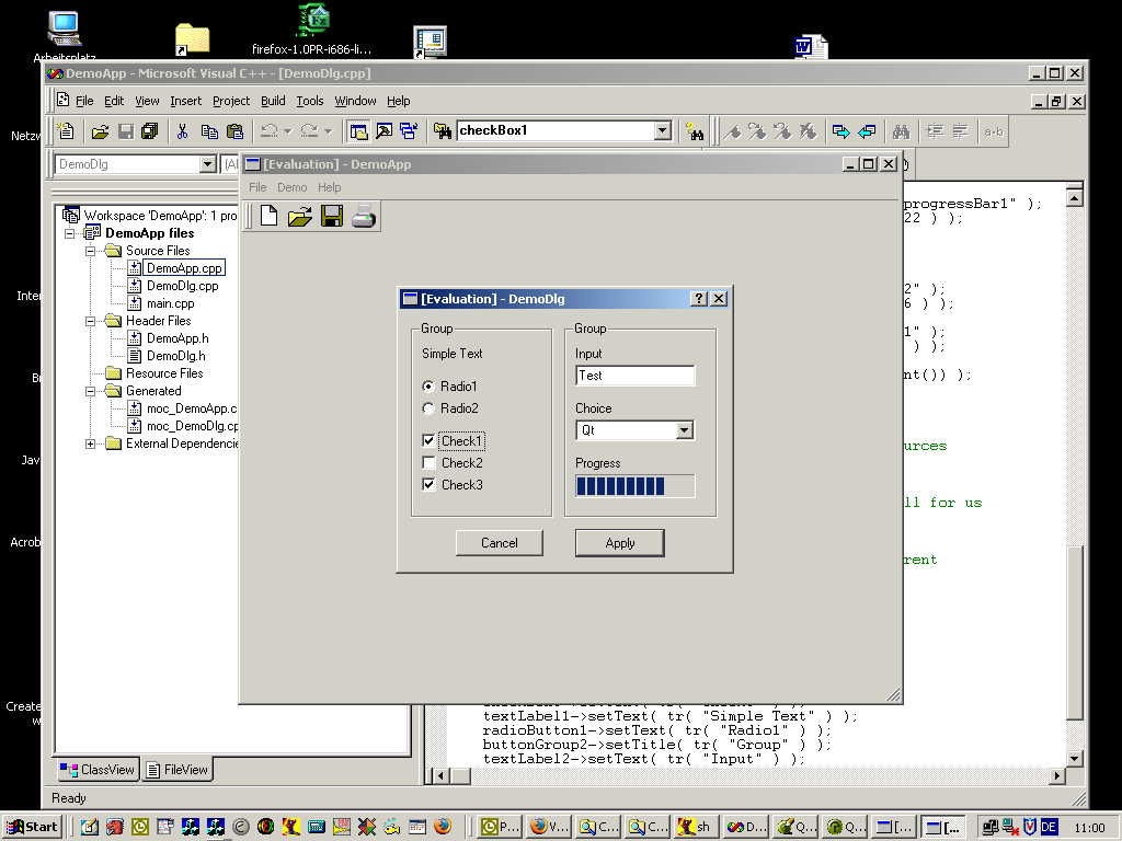 Per essere in grado di confrontare i vari pacchetti di software verra' generata una applicazione di esempio, usando tutte le librerie. L'implementazione dell'applicazione non possiede alcuna funzionalita' ma mostra tutti i controlli piu' importanti. Per il lato windows verra' creato puro software Windows (Visual C++ 6.0, MFC Class-Library), gli altri pacchetti verranno comparati in base all'aspetto (look & feel). Come distro linux usero' una RedHat Fedora Core 2 e Debian 3.0.