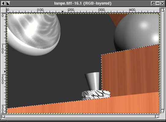 Zodra je een selctie hebt, kan je gaan spelen met de kleur. Hier heb ik gewoon de cyaan/rood knop van het "kleurenbalans" menu (" rechts klikken -> Image -> Colors -> Color Balance") meer naar cyaan gezet, om de dominante kleur van het hout wat te minderen. In dit menu is het mogelijk om te kiezen welk kleurenbereik je wilt wijzigen: helder, middentonen, schaduwen...