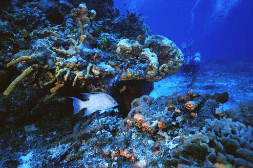 De dominante kleur in dit plaatje is blauw/cyaan. Er is ruimte voor verbetering van de voorgrond in het algemeen en de vis zelf in het bijzonder.