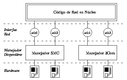 Como se explicaba en el capítulo 2, el núcleo accede a un dispositivo mediante lo que llamábamos una interfaz. Las interfaces ofrecen un conjunto abstracto de funciones que es el mismo para todo tipo de hardware. Por ejemplo, con funciones para enviar o recibir datagramas.